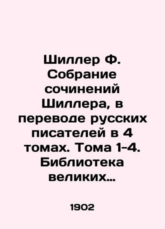 Schiller F. A collection of works by Schiller, translated by Russian writers in 4 volumes. Volumes 1-4. Library of great writers. With historical and literary commentary, prints and drawings in the text. Edited by S.A. Vengerov./Shiller F. Sobranie sochineniy Shillera, v perevode russkikh pisateley v 4 tomakh. Toma 1-4. Biblioteka velikikh pisateley. S istoriko-literaturnymi kommentariyami, estampami i risunkami v tekste. Pod red. S.A. Vengerova. Schiller F. Collection of Schillers works, translated by Russian writers in 4 volumes. Volumes 1-4. Library of great writers. With historical and literary commentary, prints and drawings in the text. Edited by S. A. Vengerov. St. Petersburg: Brockhaus-Ephron, 1900-1902. Volumes in the selection.We have thousands of titles and often several copies of each title may be available. Please feel free to contact us for a detailed description of the copies available. SKUbd-7348ada558097113.