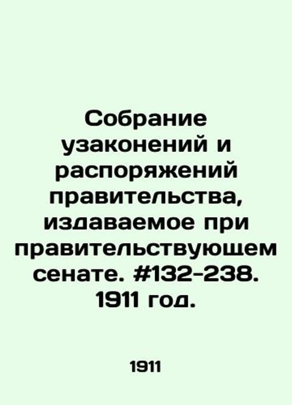 Assembly of Laws and Orders of the Government issued by the Government Senate. # 132-238. 1911./Sobranie uzakoneniy i rasporyazheniy pravitelstva, izdavaemoe pri pravitelstvuyushchem senate. #132-238. 1911 god. Senate Printing House. St. Petersburg. 1911. Department one. Second half. Publication of the law in the Assembly of Laws and Orders of the Government had the effect of officially promulgating it. We have thousands of titles and often several copies of each title may be available. Please feel free to contact us for a detailed description of the copies available. SKUbd-76451d1d63518dbc.