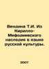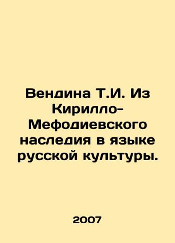 T.I. Vendina from the Kirillo-Methodist heritage in the language of Russian culture./Vendina T.I. Iz Kirillo-Mefodievskogo naslediya v yazyke russkoy kultury. M. Institute of Slavonic Studies of the Russian Academy of Sciences, 2007. The monograph is devoted to the problem of the Cyrillic-Methodist heritage in the language of Russian culture. Exploring such concepts as life and death, truth, good and evil, beauty and ugliness, love, work and work, word, knowledge, count and number, the author describes their conceptualization in Old Slavonic and Russian written and non-book languages of the 11th-17th centuries and in modern Russian in its literary and dialectical form, and shows how each of them understands these fundamental concepts of culture within the boundaries of the word. Tatyana Ivanova Vendina (born April 29, 1946, Mezhirechka, Odessa region) is a Soviet and Russian Slavic linguist.We have thousands of titles and often several copies of each title may be available. Please feel free to contact us for a detailed description of the copies available. SKUbd-b87a34d4f7970276.