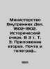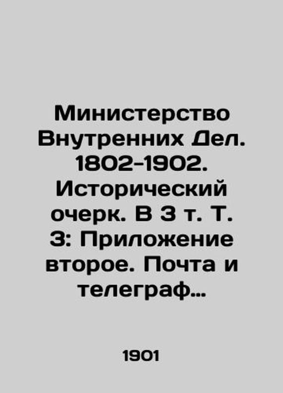 Ministry of Home Affairs. 1802-1902. Historical Essay. In 3 Vol. Vol. 3: Appendix Two. Post and Telegraph in the nineteenth century./Ministerstvo Vnutrennikh Del. 1802-1902. Istoricheskiy ocherk. V 3 t. T. 3: Prilozhenie vtoroe. Pochta i telegraf v XIX stoletii. Ministry of Internal Affairs. 1802-1902. Historical Essay. In 3 Vol. Vol. 3: Appendix II. Post and Telegraph in the 19th Century. St. Petersburg: Type. Ministry of Internal Affairs, 1901. 6, 248, VIII p.: 41.5 - 30 sm.. SKUbd-802393b997d92b41.We have thousands of titles and often several copies of each title may be available. Please feel free to contact us for a detailed description of the copies available. The delivery of this book might be delayed beyond the usual time due to extended processing and preparation before shipment, and faster shipping options are not offered. Please inform us if you need the order by a certain date or have a deadline.SKUbd-802393b997d92b41