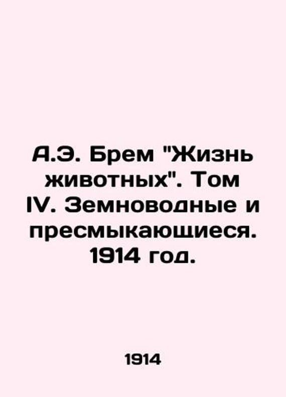 A.E. Brems Animal Life. Volume IV. Amphibians and Reptiles. 1914. /A.E. Brem Zhizn zhivotnykh. Tom IV. Zemnovodnye i presmykayushchiesya. 1914 god. Russian Book Association The Worker. Approximately 2,000 drawings in the text, more than 500 color tables carved on copper and wood, and 13 maps. The fourth, completely revised edition of Prof. Dr. Otto Zur-Strassen. Authorized translation, edited by Professor N.M. Knipovich, Psychoneurological and Womens Medical Institute, St. Petersburg, 1914. Alfred Edmund Brahm (1829-1884) is a German zoologist and traveler, author of the world-famous popular scientific work Animal Life. His father was Ludwig Brehm, a famous European bird researcher.We have thousands of titles and often several copies of each title may be available. Please feel free to contact us for a detailed description of the copies available. The delivery of this book might be delayed beyond the usual timeframe due to extended processing and preparation before shipment, and faster shipping options are not offered. Please inform us if you need the order by a certain date or have a deadline.SKUbd-803bd76948504a63