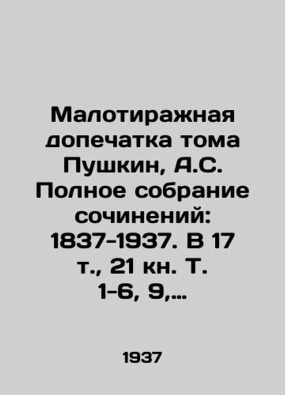 Small print run of Pushkin, A.C. Complete collection of essays: 1837-1937. In 17 volumes, 21 books, Vol. 1-6, 9, 11-14, 16. Total 15 books/Malotirazhnaya dopechatka toma Pushkin, A.C. Polnoe sobranie sochineniy: 1837-1937. V 17 t., 21 kn. T. 1-6, 9, 11-14, 16. Vsego 15 knig. Red. ko Small print run of Volume Pushkin, A.C. Complete Works: 1837-1937. We have thousands of titles and often several copies of each title may be available. Please feel free to contact us for a detailed description of the copies available. SKUbd-808c8f39bb94084f.