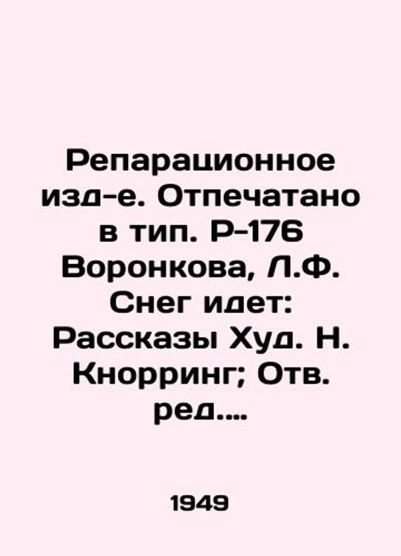 "Repatriation Publishing House. Printed in type. R-176 Voronkova, L.F. Snow Goes: Stories by Hud N. Knorring; Rev. E. Emden./Reparatsionnoe izd-e. Otpechatano v tip. R-176 Voronkova, L.F. Sneg idet: Rasskazy Khud. N. Knorring; Otv. red. E. Emden. Repatriation Publishing House. Printed in type. R-176 Voronkova, L.F. Snow Goes: Stories by Hud N. Knorring; Rev. Ed. E. Emden. M.; L.: Detgiz, 1949.-60 p.:. We have thousands of titles and often several copies of each title may be available. Please feel free to contact us for a detailed description of the copies available. SKUbd-81f2934b66a97603."