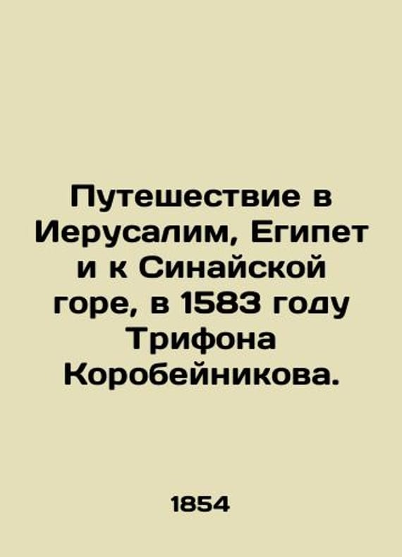 Journey to Jerusalem, Egypt, and Mount Sinai in 1583 by Trifon Korobeynikov./Puteshestvie v Ierusalim, Egipet i k Sinayskoy gore, v 1583 godu Trifona Korobeynikova. Journey to Jerusalem, Egypt and Sinai Mount, in 1583 by Trifon Korobeynikov. Moscow: In Type M. Smirnova, 1854. 3-52, 57-108 p., 3 liters. 17.7 - 11.5 sm. We have thousands of titles and often several copies of each title may be available. Please feel free to contact us for a detailed description of the copies available. SKUbd-83e2e59b88610003.