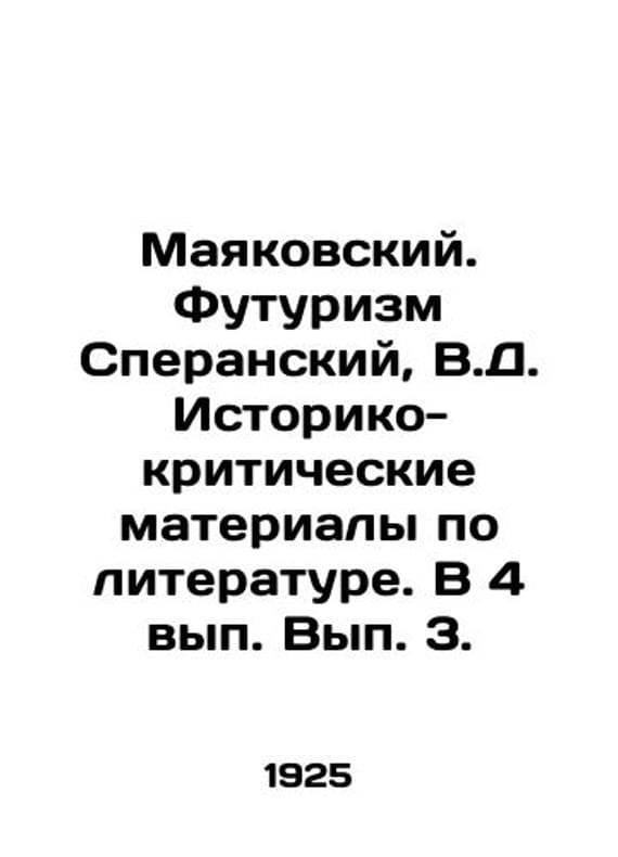 Mayakovsky. Futurism by Speransky, V.D. Historical and Critical Materials on Literature/Mayakovskiy. Futurizm Speranskiy, V.D. Istoriko-kriticheskie materialy po literature. V 4 vyp. Vyp. 3. Mayakovsky. Futurism by Speransky, V.D. Historical and Critical Materials on Literature.. SKUbd-84a636e9b358a375.We have thousands of titles and often several copies of each title may be available. Please feel free to contact us for a detailed description of the copies available. The delivery of this book might be delayed beyond the usual time due to extended processing and preparation before shipment, and faster shipping options are not offered. Please inform us if you need the order by a certain date or have a deadline.SKUbd-84a636e9b358a375