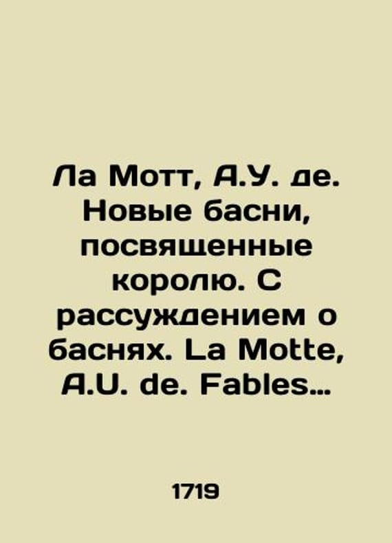 La Motte, A.U. de. New fable about the king. With a discussion of fable. La Motte, A.U. de. Fables nouvelles dediees au roy. Avec un discussions sur la fable/La Mott, A.U. de. Novye basni, posvyashchennye korolyu. S rassuzhdeniem o basnyakh. La Motte, A.U. de. Fables nouvelles dediees au roy. Avec un discours sur la fable. Na fr. yaz. Parizh: chez Georges Dupuis, 17 La Motte, A.U. de. New fable about the king. With a discussion of fable. La Motte, A.U. de. Fables nouvelles dediees au roy. Avec un discussions sur la fable. In French: chez Georges Dupuis, 1719. XLII, 358, 6 p. We have thousands of titles and often several copies of each title may be available. Please feel free to contact us for a detailed description of the copies available. SKUbd-84bf02b7b9167480.