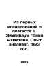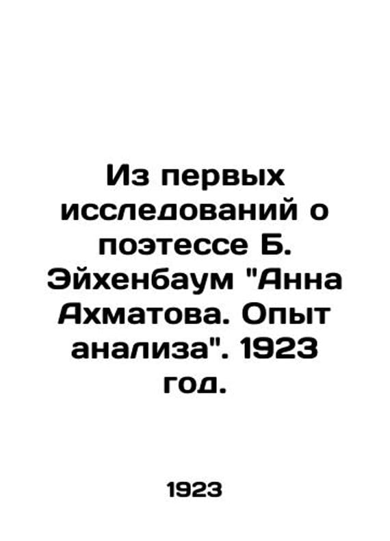 From the first studies on the poet B. Eichenbaum Anna Akhmatova. Experience of analysis. 1923./Iz pervykh issledovaniy o poetesse B. Eykhenbaum Anna Akhmatova. Opyt analiza. 1923 god. St. Petersburg, 1923. Critical analysis of the work of young Anna Akhmatova, whose first book of poems was published ten years ago (in 1912). Anna Andreevna liked the book until August 1946, when Zhdanov, describing Akhmatova, called her both a nun and a harlot after reading from Eichenbaum:.. the image of a heroine, not that of a harlot with violent passions, not that of a beggar nun, who can beg Gods forgiveness.We have thousands of titles and often several copies of each title may be available. Please feel free to contact us for a detailed description of the copies available. The delivery of this book might be delayed beyond the usual timeframe due to extended processing and preparation before shipment, and faster shipping options are not offered. Please inform us if you need the order by a certain date or have a deadline.SKUbd-881850e1be344b50