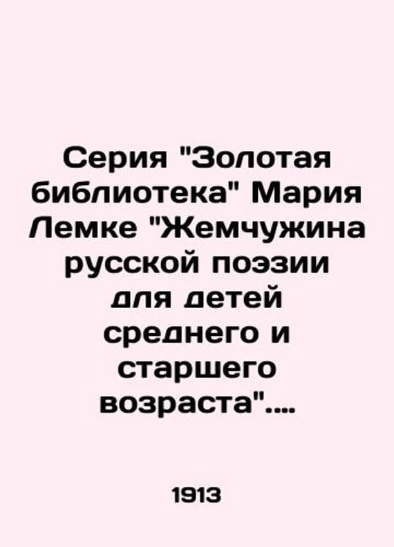 Maria Lemkes Golden Library series, Pearl of Russian Poetry for Middle and Senior Children, 1913./Seriya Zolotaya biblioteka Mariya Lemke Zhemchuzhina russkoy poezii dlya detey srednego i starshego vozrasta. 1913 god. Edition of Volf. St. Petersburg-Moscow, 1913.We have thousands of titles and often several copies of each title may be available. Please feel free to contact us for a detailed description of the copies available. The delivery of this book might be delayed beyond the usual timeframe due to extended processing and preparation before shipment, and faster shipping options are not offered. Please inform us if you need the order by a certain date or have a deadline.SKUbd-8826ec02556aa978