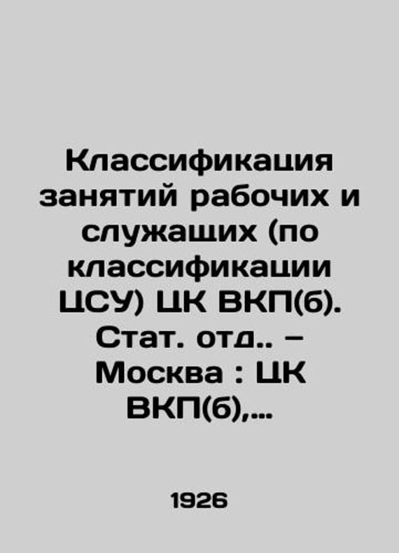 Classification of the Occupations of Workers and Employees (according to the Classification of the CSU) of the Central Committee of the Communist Party of the Soviet Union (b)/Klassifikatsiya zanyatiy rabochikh i sluzhashchikh (po klassifikatsii TsSU) TsK VKP(b). Stat. otd. Moskva: TsK VKP(b), 1926. 8 s.: 26x18 sm. Classification of the Occupations of Workers and Employees (according to the Classification of the CSU) of the Central Committee of the Communist Party of the Soviet Union (b).We have thousands of titles and often several copies of each title may be available. Please feel free to contact us for a detailed description of the copies available. SKUbd-8bdd9d80da466263.