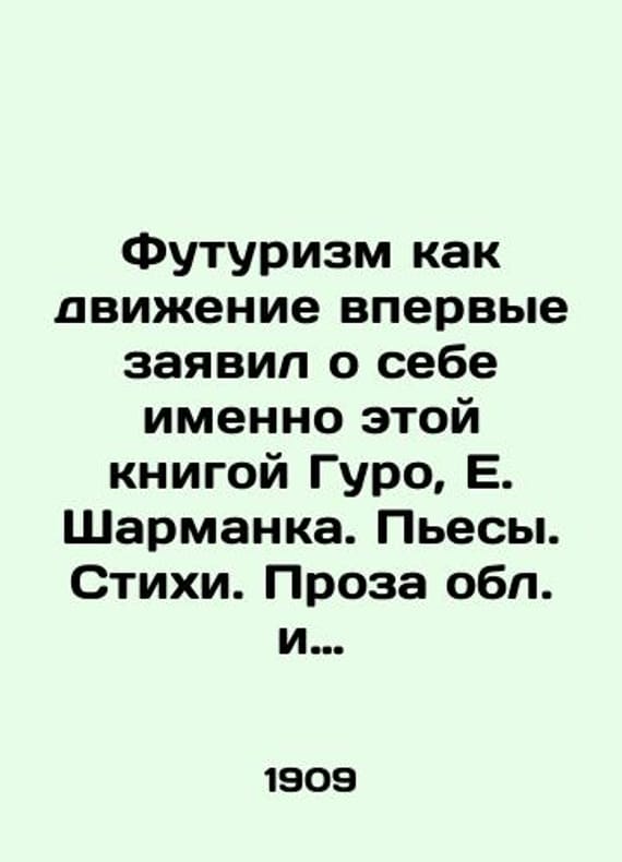 Futurism as a movement first announced itself with this book by Guro, E. Sharmanka. Plays. Poems. Prose and figures by E. Guro, N. Lubavina, muse by M. Matyushin./Futurizm kak dvizhenie vpervye zayavil o sebe imenno etoy knigoy Guro, E. Sharmanka. Pesy. Stikhi. Proza obl. i ris. E. Guro, N. Lyubavinoy, muz. M. Matyushina. Futurism as a movement first announced itself with this book by Guro, E. Sharmanka. Plays. Poems. Prose and figures by E. Guro, N. Lyubavina, muse by M. Matyushin. St. Petersburg, 1909-1914. 218, 10 p., 3 lit. notes: 19,2 - 14 sm.We have thousands of titles and often several copies of each title may be available. Please feel free to contact us for a detailed description of the copies available. SKUbd-8c4b69f2f82d5082.