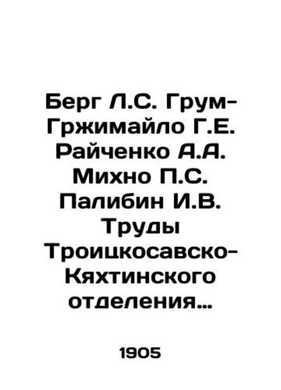 "Berg L.S. Groom-Grzhimailo G.E. Raichenko A.A. Mikhno S. Palibin I.V. Proceedings of the Troitsko-Sava-Kyakhta Branch of the Priamur Department of the Imperial Russian Geographical Society. 1905, Vol. 8, Volume 3 - Typo-lit. Herold, 1906. -80, VIII p.: 3 l./Berg L.S. Grum-Grzhimaylo G.E. Raychenko A.A. Mikhno S. Palibin I.V. Trudy Troitskosavsko-Kyakhtinskogo otdeleniya Priamurskogo otdela Imperatorskogo Russkogo geograficheskogo obshchestva. 1905 g. T. 8. Vyp. 3.-Tipo-lit. Gerold, 1906. -80, VIII s.: 3 l. Travel diary of the Kosovo excursion (with 2 phototypes and a map) by S. Mikhno. Material for the flora of Zabaikalia; Material for the flora of sowing Mongolia by I.V. Palibin. About the blue-green algae Nostoc pruniforme Agardh by A.A. Raichenko. A note about the fish of Lake Kosogola by L.S. Berg. Butterflies collected between the river Jida and Lake Kosogol, S. Mikhno by G.E. Grum-Grzhimailo.We have thousands of titles and often several copies of each title may be available. Please feel free to contact us for a detailed description of the copies available. SKUbd-8ef568f96f375594."