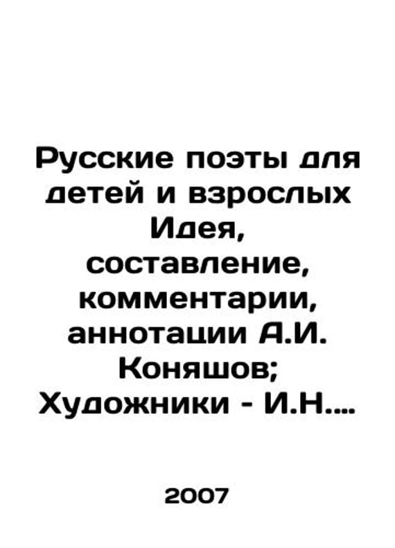 "Russian Poets for Children and Adults Idea, Compilation, Comments, Annotations by A.I. Konyashov; Artists by I.N. Kireeva, A.B. Orlovsky, Yu. Perezentsev./Russkie poety dlya detey i vzroslykh Ideya, sostavlenie, kommentarii, annotatsii A.I. Konyashov; Khudozhniki I.N. Kireeva, A.B. Orlovskiy, Yu. Perevezentsev. The anthology Russian Poets for Children and Adults contains poems by more than fifty Russian and Soviet poets, including Mandelshtam, Khodasevich, Gumilev, Zabolotsky, Pushkin, Lermontov, Bagritsky, Fet, Tsvetaeva, Blok, Lomonosov, Burlyuk, Tarkovsky and many others. It includes both little-known works by authors and poems that have become the poets calling cards. We have thousands of titles and often several copies of each title may be available. Please feel free to contact us for a detailed description of the copies available. SKUbd-919ea1fda507ee20."