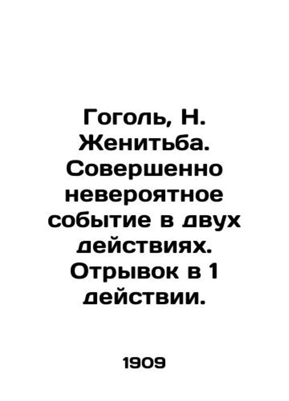 Gogol, N. Marriage. Absolutely incredible event in two acts. Excerpt in 1 act./Gogol, N. Zhenitba. Sovershenno neveroyatnoe sobytie v dvukh deystviyakh. Otryvok v 1 deystvii. Gogol, N. Marriage. An absolutely incredible event in two acts. Excerpt in 1 act. St. Petersburg: Directorate of Imperial Theatres, 1909. 74 p.: il. We have thousands of titles and often several copies of each title may be available. Please feel free to contact us for a detailed description of the copies available. SKUbd-98c7c4145774546d.