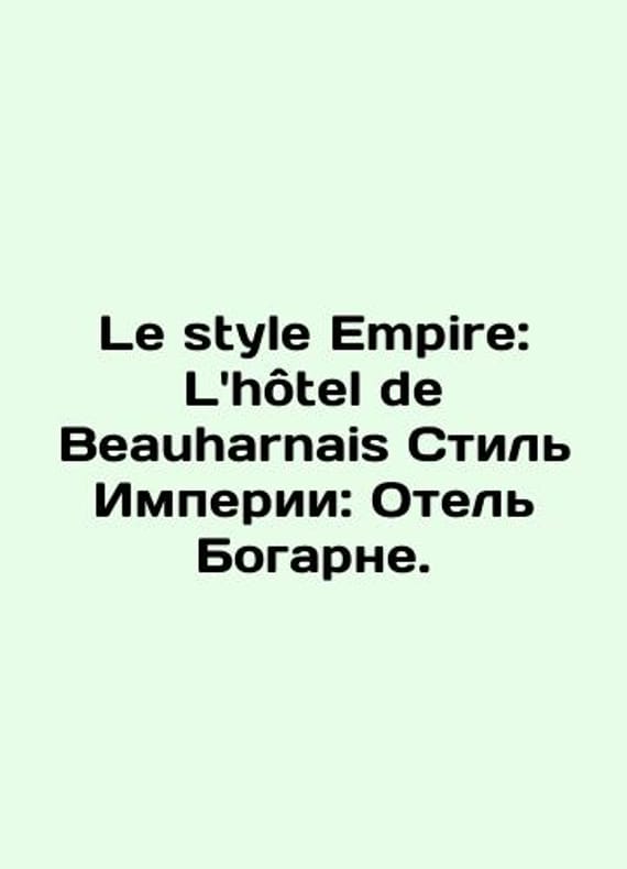 Le style Empire: Lhtel de Beauharnais Empire style: Hotel Bogarnay./Le style Empire: Lhotel de Beauharnais Stil Imperii: Otel Bogarne. Palais de lAmbassade dAllemagne Paris. Librairie centrale dArt et dArchitecture. Paris Palace of the German Embassy in Paris. Central Art and Architecture Bookstore. Paris. Hotel Bogarnay: historic mansion, type of large French townhouse, in the 7th arrondissement of Paris. It was designed by architect Germaine Beauffrand.We have thousands of titles and often several copies of each title may be available. Please feel free to contact us for a detailed description of the copies available. The delivery of this book might be delayed beyond the usual timeframe due to extended processing and preparation before shipment, and faster shipping options are not offered. Please inform us if you need the order by a certain date or have a deadline.SKUbd-9e8288d53bcc6da0