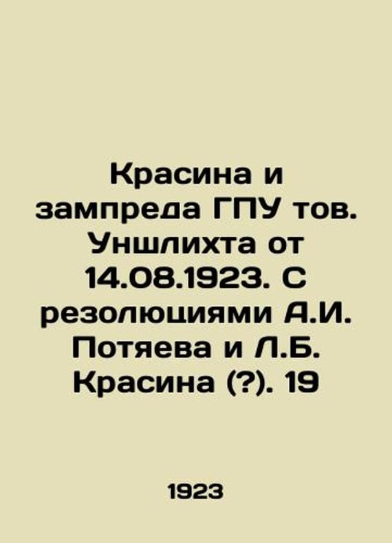 Krasina and Deputy Chairman of the GPU Comrade Unschlicht dated 14.08.1923. With resolutions by A.I. Potyaev and L.B. Krasin (?). 19/Krasina i zampreda GPU tov. Unshlikhta ot 14.08.1923. S rezolyutsiyami A.I. Potyaeva i L.B. Krasina (?). 19 Krasina and Deputy Chairman of the GPU Comrade Unschlicht of 14.08.1923. With resolutions by A.I. Potyaev and L.B. Krasin (?). 1923.We have thousands of titles and often several copies of each title may be available. Please feel free to contact us for a detailed description of the copies available. SKUbd-a2846b07ecea0ff6.