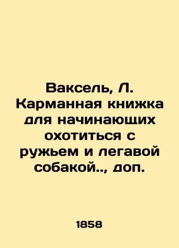 Vaxel, L. Pocket book for beginners in hunting with a gun and a legal dog.., additional./Vaksel, L. Karmannaya knizhka dlya nachinayushchikh okhotitsya s ruzhem i legavoy sobakoy., dop. Viability, practicality of advice and affordability Vaxel, L. Pocket book for beginners to hunt with a gun and a legal dog, St. Petersburg: In Type E. Prats, 1858. VIII, 227 p. We have thousands of titles and often several copies of each title may be available. Please feel free to contact us for a detailed description of the copies available. SKUbd-a3e90064b3c6000a.
