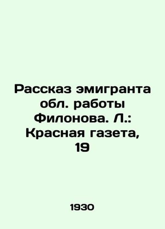 The story of an emigrant in the region. Filonovs work. L.: Krasnaya Gazeta, 19/Rasskaz emigranta obl. raboty Filonova. L.: Krasnaya gazeta, 19 The story of an emigrant in the region. Filonovs work. L.: Krasnaya Gazeta, 1930. 96We have thousands of titles and often several copies of each title may be available. Please feel free to contact us for a detailed description of the copies available. The delivery of this book might be delayed beyond the usual timeframe due to extended processing and preparation before shipment, and faster shipping options are not offered. Please inform us if you need the order by a certain date or have a deadline.SKUbd-a46bb47f832995a9