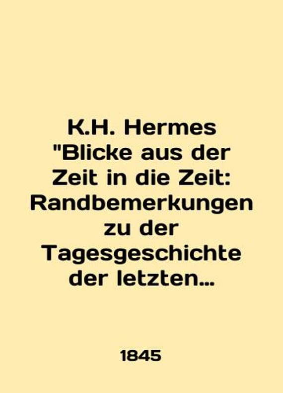 K.H. Hermes Blicke aus der Zeit in die Zeit: Randbemerkungen zu der Tagesgeschichte der letzten funfundzwanzig Jahre Karl Heinrich Hermes Looking from the past to the past: notes in the margins of daily history for the last twenty-five years. 1845./K.H. Hermes Blicke aus der Zeit in die Zeit: Randbemerkungen zu der Tagesgeschichte der letzten fuenfundzwanzig Jahre Karl Genrikh Germes Vzglyad iz proshlogo v proshloe: zametki na polyakh ezhednevnoy istorii za poslednie dvadtsat pyat let. 1845 god. Druck und verlag von George Veltermann. Braunschweig, 1845. Book by the German journalist, publicist, and publisher Karl Heinrich Hermes. The book covers Germany, society, politics, social science, press freedom, censorship, and the history of the country.We have thousands of titles and often several copies of each title may be available. Please feel free to contact us for a detailed description of the copies available. The delivery of this book might be delayed beyond the usual timeframe due to extended processing and preparation before shipment, and faster shipping options are not offered. Please inform us if you need the order by a certain date or have a deadline.SKUbd-a4aee6482308b281