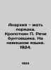 Anarchy is the mother of order. Kropotkin Speeches of a rebel. In German. 1924./Anarkhiya mat poryadka. Kropotkin Rechi buntovshchika. Na nemetskom yazyke. 1924. Anarchy is the mother of order. Kropotkin Speeches of a rebel. In German. Translation from French approved by the author, with his approved footnotes and explanations, prepared as a token of appreciation from Pierre Ramu. Second full German edition. 1924. Publishing House Knowledge and Liberation. Vienna / Klosterneuburg-Mannheim. XVI, 240 pp.We have thousands of titles and often several copies of each title may be available. Please feel free to contact us for a detailed description of the copies available. SKUbd-23660f1c303d023.