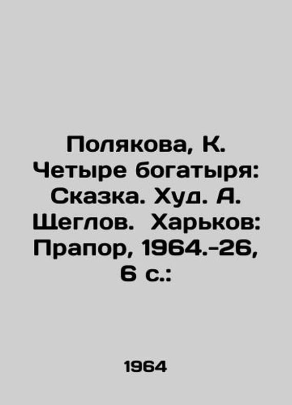 Polyakova, K. Four Bogatyrs: Tale. Hud. A. Shcheglov. Kharkov: Prapor, 1964-26, 6 p.:/Polyakova, K. Chetyre bogatyrya: Skazka. Khud. A. Shcheglov. Kharkov: Prapor, 1964.-26, 6 s.: Polyakova, K. Four Bogatyrs: Tale. Hud. A. Shcheglov. Kharkov: Prapor, 1964-26, 6 p.:. We have thousands of titles and often several copies of each title may be available. Please feel free to contact us for a detailed description of the copies available. SKUbd-a81ba4d6df90140a.