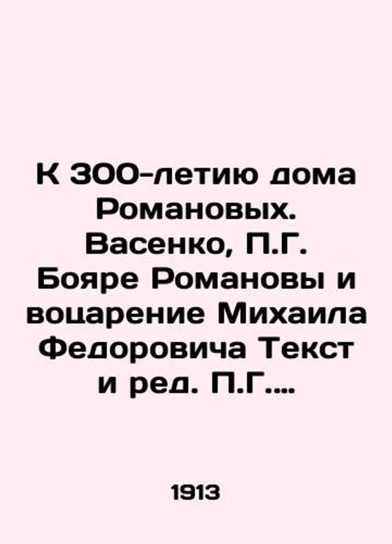 To the 300th Anniversary of the House of Romanov. Vasenko, G. Boyare Romanovs and the Emperor of Mikhail Fedorovich Text and Edited by G. Vasenko./K 300-letiyu doma Romanovykh. Vasenko, G. Boyare Romanovy i votsarenie Mikhaila Fedorovicha Tekst i red. G. Vasenko.- To the 300th Anniversary of the House of Romanov. Vasenko, G. Boyare Romanov and the Emperor of Mikhail Fedorovich Text and Edited by G. Vasenko-St. Petersburg: A Comment for the Arrangement of the Celebration of the 300th Anniversary of the Reign of the House of Romanov, 1913.-224, XII, 1 We have thousands of titles and often several copies of each title may be available. Please feel free to contact us for a detailed description of the copies available. SKUbd-a9480eeac8f4f1b.