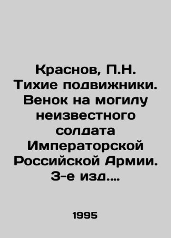 Krasnov, N. Silent ascetics. Wreath on the tomb of an unknown soldier of the Imperial Russian Army. Jordanville, 3rd edition: Typography of St. Job of Pochaevsky, 19/Krasnov, N. Tikhie podvizhniki. Venok na mogilu neizvestnogo soldata Imperatorskoy Rossiyskoy Armii. 3-e izd. Dzhordanvill: Tipografiya prepodobnogo Iova Pochaevskogo, 19 Krasnov, N. Silent ascetics. Wreath at the tomb of an unknown soldier of the Imperial Russian Army. Jordanville, 3rd edition: Typography of St. Job of Pochaevsky, 1995.We have thousands of titles and often several copies of each title may be available. Please feel free to contact us for a detailed description of the copies available. SKUbd-aa208840c137b9a3.