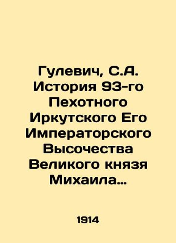 Gulevich, S.A. History of the 93rd Infantry of Irkutsk by His Imperial Highness Grand Duke Mikhail Alexandrovich Regiment from 1785 to 1913/Gulevich, S.A. Istoriya 93-go Pekhotnogo Irkutskogo Ego Imperatorskogo Vysochestva Velikogo knyazya Mikhaila Aleksandrovicha polka s 1785 po 1913 god. Izdanie polka. Gulevich, S.A. History of the 93rd Infantry of Irkutsk, His Imperial Highness Grand Duke Mikhail Alexandrovich Regiment from 1785 to 1913. We have thousands of titles and often several copies of each title may be available. Please feel free to contact us for a detailed description of the copies available. SKUbd-aa3baf4e0090161c.