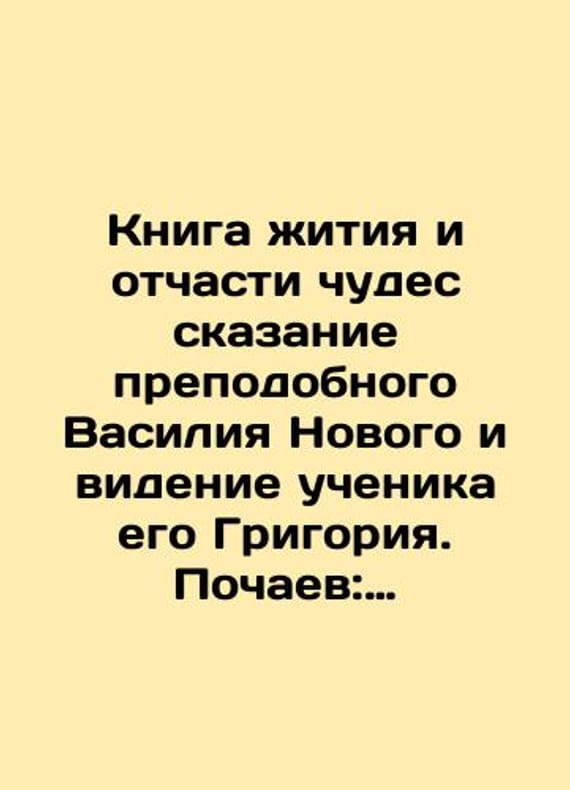 The Book of Life and Part of Miracles, the Tale of St. Basil the New and the Vision of His Disciple Grigory. Pochaev: The Pochaev Type, late 19th century/Kniga zhitiya i otchasti chudes skazanie prepodobnogo Vasiliya Novogo i videnie uchenika ego Grigoriya. Pochaev: Pochaevskaya tip., konets XIX v. The Book of Life and Part of Miracles, the Tale of St. Basil the New and the Vision of His Disciple Grigory. Pochaev: The Pochaev Type, late 19th century. We have thousands of titles and often several copies of each title may be available. Please feel free to contact us for a detailed description of the copies available. SKUbd-aaafc9bfa15fcb02.