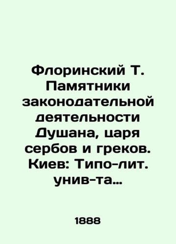 Monuments to the legislative activity of Dushan, the king of Serbs and Greeks. Kyiv: Typo-lit. university of St. Vladimir, 1888./Florinskiy T. Pamyatniki zakonodatelnoy deyatelnosti Dushana, tsarya serbov i grekov. Kiev: Tipo-lit. univ-ta Sv.Vladimira, 1888. The Monuments of the Legislative Activities of Dusan, King of Serbs and Greeks. Chrysobules. Serbian Lawyer. Compilations of Byzantine Laws. Kyiv: Typo-lit. Univ of St. Vladimir, 1888. We have thousands of titles and often several copies of each title may be available. Please feel free to contact us for a detailed description of the copies available. SKUbd-aac5176ddde13c8f.