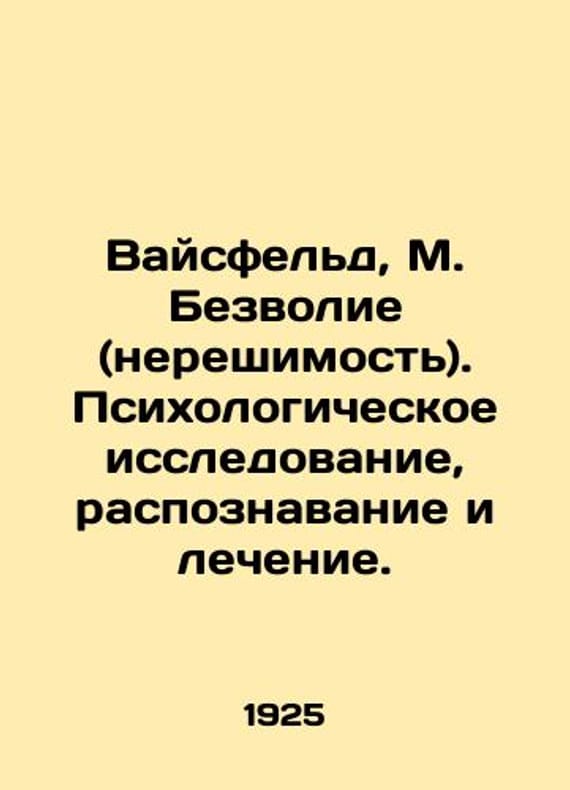 Weisfeld, M. Bezvoliya (indecision). Psychological research, recognition, and treatment./Vaysfeld, M. Bezvolie (nereshimost). Psikhologicheskoe issledovanie, raspoznavanie i lechenie. Weisfeld, M. Bezvoliye (indecision). Psychological Research, Recognition, and Treatment. Moscow: Publishing House, 1925.92 p. We have thousands of titles and often several copies of each title may be available. Please feel free to contact us for a detailed description of the copies available. SKUbd-aca363cf5982f06f.
