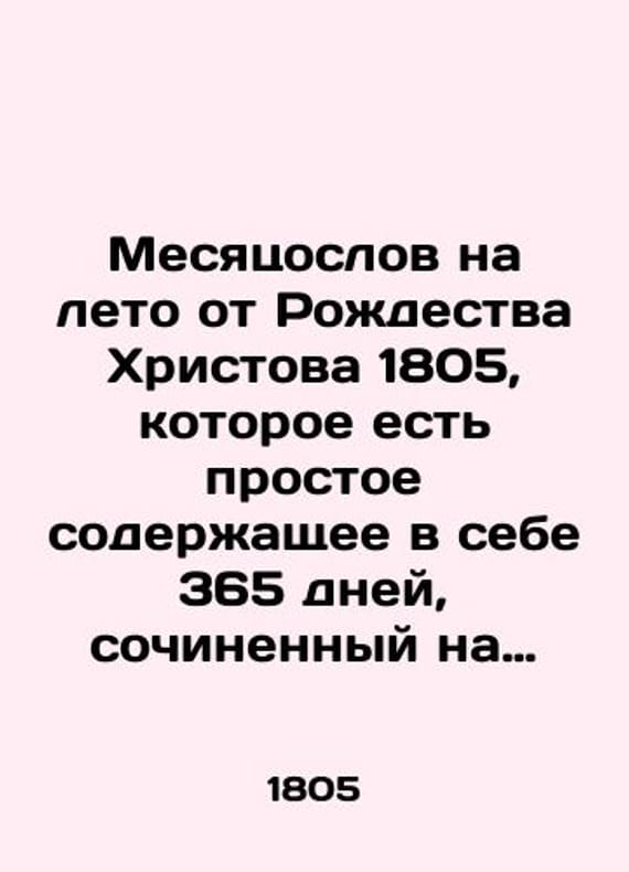Months of donkeys for the summer from the birth of Christ in 1805, which is a simple one containing 365 days, composed on the noblest places of the Russian Empire./Mesyatsoslov na leto ot Rozhdestva Khristova 1805, kotoroe est prostoe soderzhashchee v sebe 365 dney, sochinennyy na znatneyshiya mesta Rossiyskoy imperii. Months of Donkeys for the summer from the Nativity of Christ 1805, which is a simple one containing 365 days, composed on the noblest places of the Russian Empire. St. Petersburg: Under the Imperial Academy of Sciences, 1804. We have thousands of titles and often several copies of each title may be available. Please feel free to contact us for a detailed description of the copies available. SKUbd-ada7f1588f7eddb1.