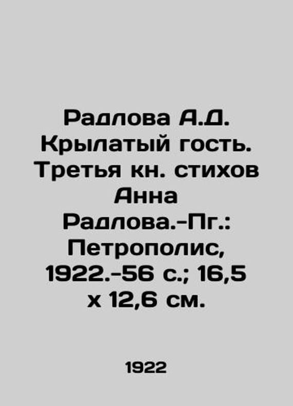 "Radlova A.D. The Winged Guest. Anna Radlovas Third Book of Poems: Petropolis, 1922.-56 p.; 16.5x12.6 sm./Radlova A.D. Krylatyy gost. Tretya kn. stikhov Anna Radlova.-Pg.: Petropolis, 1922.-56 s.; 16,5x12,6 sm. In the early 1920s, Radlova was part of a group of emotivists led by Mikhail Kuzmin, who dedicated the first part of his last book of his life (1929), Trout Breaks the Ice. She published three poetry collections: Sooty (1918), Ships (1920), Winged Guest (1922). We have thousands of titles and often several copies of each title may be available. Please feel free to contact us for a detailed description of the copies available. SKUbd-af43eb9f1641e72a."
