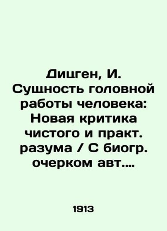 "Short description: Dietzgen, I. The Essence of the Human Head Work: A New Critique of Pure and Practical Reason / With a Biographical Essay by Eugene Dietzgen's Author Anton Pannekuk; Translated with him by B.S. Weinberg; Edited by P. Daughe.-2nd ed. -M.: P.G. Dauge, 1913.-XXVIII, 124 p., 1 L. front (portrait); 24,5x16.5 cm. We have thousands of titles and often several copies of each title may be available. Please feel free to contact us for a detailed description of the copies available. SKUbd-b1f06d4f702e434b"