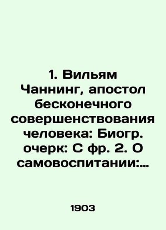 1. William Channing, the Apostle of Endless Human Improvement: A Biography Essay: C fr. 2. On Self-Education: A Speech by Channing Perr from A. Boulanger-M.: The Mediator, 1903.-178 p./1. Vilyam Channing, apostol beskonechnogo sovershenstvovaniya cheloveka: Biogr. ocherk: S fr. 2. O samovospitanii: Rech Channinga Per. s angl. A. Bulanzhe.-M.: Posrednik, 1903.-178 s. 1. William Channing, the Apostle of Endless Human Improvement: A Biography Essay: C fr. 2. On Self-Education: A Speech by Channing Perr from A. Boulanger-M.: The Mediator, 1903.-178We have thousands of titles and often several copies of each title may be available. Please feel free to contact us for a detailed description of the copies available. The delivery of this book might be delayed beyond the usual timeframe due to extended processing and preparation before shipment, and faster shipping options are not offered. Please inform us if you need the order by a certain date or have a deadline.SKUbd-b2912d90f3e76990