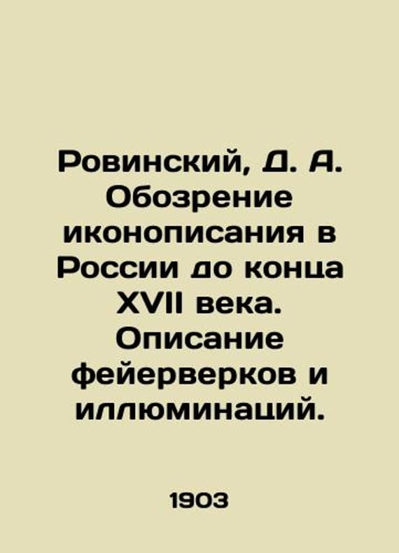 Rovinsky, D. A. Review of iconography in Russia until the end of the 17th century. Description of fireworks and illuminations./Rovinskiy, D. A. Obozrenie ikonopisaniya v Rossii do kontsa XVII veka. Opisanie feyerverkov i illyuminatsiy. Ill.: 1903. 1 l. We have thousands of titles and often several copies of each title may be available. Please feel free to contact us for a detailed description of the copies available. The delivery of this book might be delayed beyond the usual timeframe due to extended processing and preparation before shipment, and faster shipping options are not offered. Please inform us if you need the order by a certain date or have a deadline.SKUbd-b7da6d56dafa2e89
