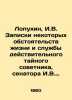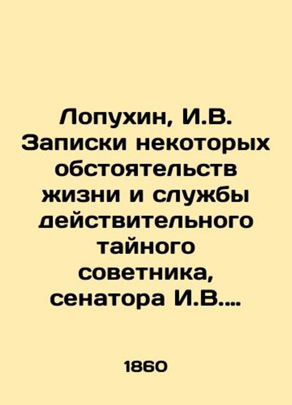 Lopukhin, I.V. Notes of some circumstances of life and service of the real secret adviser, Senator I.V. Lopukhin, written by himself./Lopukhin, I.V. Zapiski nekotorykh obstoyatelstv zhizni i sluzhby deystvitelnogo taynogo sovetnika, senatora I.V. Lopukhina, sochinennye im samim. Lopukhin, I.V. Notes on certain circumstances of life and service of the real secret adviser, Senator I.V. Lopukhin, written by himself. M.: In the Univ. Type., 1860.We have thousands of titles and often several copies of each title may be available. Please feel free to contact us for a detailed description of the copies available. SKUbd-bd245ad67b478773.