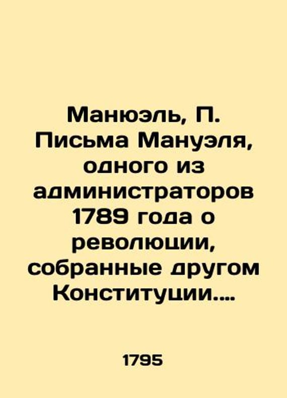 Manuel, Letters from Manuel, one of the administrators of 1789, on the revolution, collected by a friend of the Constitution. Manuel. Les Lettres de Manuel, lun des administrateurs de 1789, sur la revolution, recueillies par un ami de la Constitution./Manyuel, Pisma Manuelya, odnogo iz administratorov 1789 goda o revolyutsii, sobrannye drugom Konstitutsii. Manuel. Les Lettres de Manuel, lun des administrateurs de 1789, sur la revolution, recueillies par un ami de la Constitution. Na fr. yaz. Manuel, Letters from Manuel, one of the administrators of 1789, on the revolution, collected by a friend of the Constitution. Manuel. Les Lettres de Manuel, lun des administrateurs de 1789, sur la revolution, recueillies par un ami de la Constitution. We have thousands of titles and often several copies of each title may be available. Please feel free to contact us for a detailed description of the copies available. SKUbd-c3df8f37f3529382.