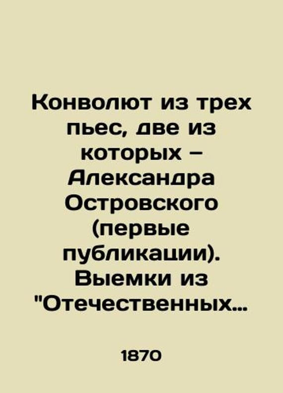 A Convolutee of Three Plays, Two of which were by Alexander Ostrovsky (First Publications)/Konvolyut iz trekh pes, dve iz kotorykh Aleksandra Ostrovskogo (pervye publikatsii). Vyemki iz Otechestvennykh zapisok. 1870-e A Convolutee of Three Plays, Two of which were by Alexander Ostrovsky (First Publications). Extracts from The Fatherland Notes. 1870. We have thousands of titles and often several copies of each title may be available. Please feel free to contact us for a detailed description of the copies available. SKUbd-c4f792607e223a7e.