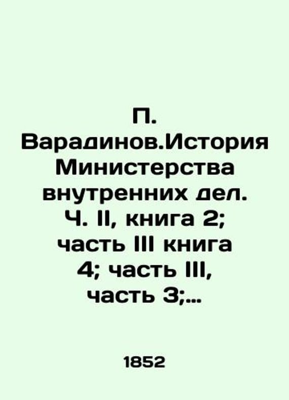 "Varadinov. History of the Ministry of Interior. Part II, book 2; Part III, book 4; Part III, part 3; Part II, book 1; Part II, book 3; Book 8, additional/ Varadinov.Istoriya Ministerstva vnutrennikh del. Ch. II, kniga 2; chast III kniga 4; chast III, chast 3; Chast II kniga 1; chast II kniga 3; Kniga 8, dopolnitelnaya Varadinov. History of the Ministry of Internal Affairs. Part II, book 2; Part III, book 4; Part III, part 3; Part II, book 1; Part II, book 3; Book 8, additional St. Petersburg. Type of the Second Department of E.I. Chancellery. 1852-1863.We have thousands of titles and often several copies of each title may be available. Please feel free to contact us for a detailed description of the copies available. SKUbd-c60b02ed3db6e5da."