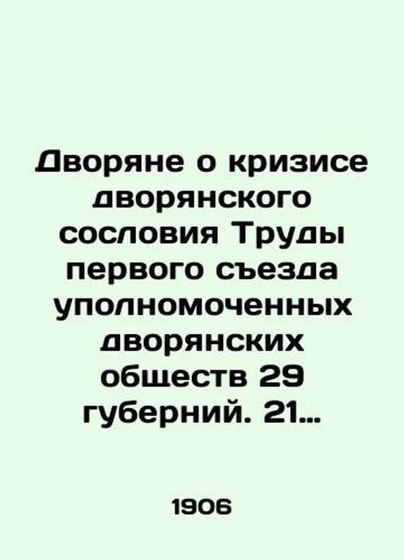 Nobles on the Crisis of the Noble Estate. Proceedings of the First Congress of Commissioners of Noble Societies of 29 governorates. May 21-28, 1906/Dvoryane o krizise dvoryanskogo sosloviya Trudy pervogo sezda upolnomochennykh dvoryanskikh obshchestv 29 guberniy. 21 28 maya 1906 g. Nobles on the crisis of the nobility estate. Proceedings of the First Congress of Commissioned Noble Societies of 29 provinces. 21-28 May 1906, St. Petersburg: Type. Voeykov, 1906. 2, 126, 3-29 pp. 25,5 - 18,5 sm.We have thousands of titles and often several copies of each title may be available. Please feel free to contact us for a detailed description of the copies available. SKUbd-c67a8d4fe8c89cc0.