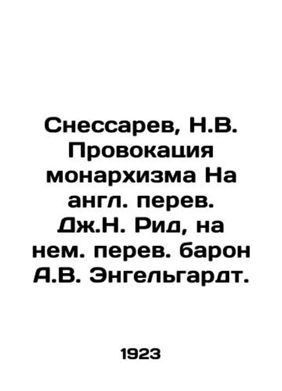"Snessarev, N.V. The provocation of monarchism In the English translation by J.N. Reed, in the German translation by Baron A.V. Engelhardt./Snessarev, N.V. Provokatsiya monarkhizma Na angl. perev. Dzh.N. Rid, na nem. perev. baron A.V. Engelgardt. Snessarev, N.V. The provocation of monarchism In English translation by J.N. Reed, in German by Baron A.W. Engelhardt. Berlin: Type E.A. Gutnov, 1923.-131, 1 p.; 18.5x13 sm. We have thousands of titles and often several copies of each title may be available. Please feel free to contact us for a detailed description of the copies available. SKUbd-c680529d60b11185."