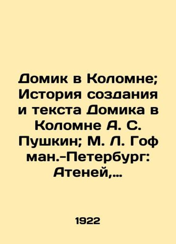 "A House in Kolomna; The History of Creation and Text of A House in Kolomna by A. S. Pushkin; M. L. Hoffmann-Petersburg: Ateney, 1922.-124 p.; 14,5x11,5 sm./Domik v Kolomne; Istoriya sozdaniya i teksta Domika v Kolomne A. S. Pushkin; M. L. Gofman.-Peterburg: Ateney, 1922.-124 s.; 14,5x11,5 sm. A House in Kolomna; The History of Creation and Text of A House in Kolomna by A. S. Pushkin; M. L. Hoffmann-Petersburg: Ateney, 1922.-124 p.; 14,5x11,5 sm. We have thousands of titles and often several copies of each title may be available. Please feel free to contact us for a detailed description of the copies available. SKUbd-c7614937a2b495e4."