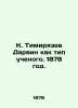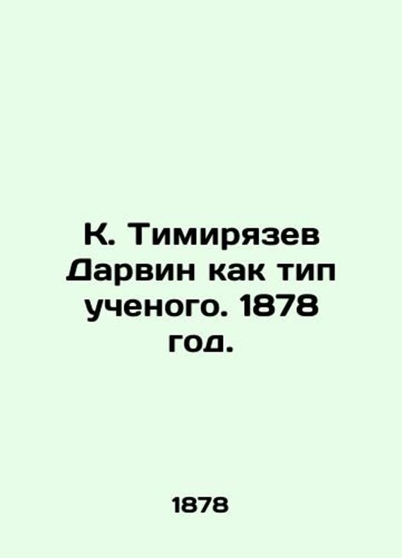 K. Timiryazev Darwin as a type of scientist. 1878./K. Timiryazev Darvin kak tip uchenogo. 1878 god. The typography of M.N. Lavrov and Co. Public lecture by K. Timiryazev. Read at Moscow University on April 2, 1878. Moscow, 1878. Kliment Arkadyevich Timiryazev (1843-1920) is a Russian natural scientist, specialist in plant physiology, major researcher of photosynthesis, one of the first propagandists of Darwins ideas about evolution in Russia, popularizer and historian of science, Emeritus Professor of Moscow University. We have thousands of titles and often several copies of each title may be available. Please feel free to contact us for a detailed description of the copies available. SKUbd-c82a7986882f771f.