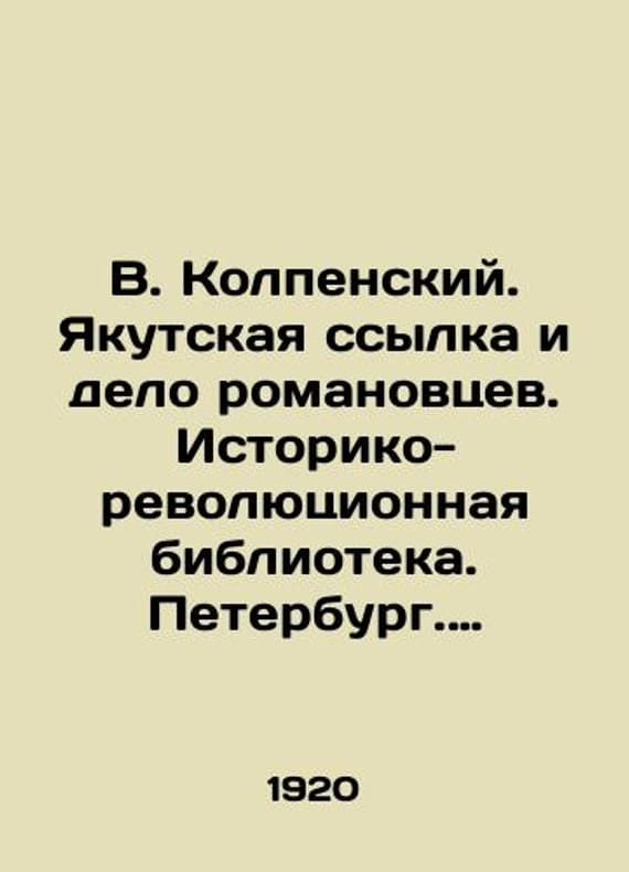 V. Kolpensky. The Yakutsk Exile and the Roman Affair. Historical and Revolutionary Library. St. Petersburg. State Publishing House. 1920. 64 p./V. Kolpenskiy. Yakutskaya ssylka i delo romanovtsev. Istoriko-revolyutsionnaya biblioteka. Peterburg. Gosudarstvennoe izdatelstvo. 1920g. 64s. V. Kolpensky. The Yakutsk Exile and the Roman Affair. Historical and Revolutionary Library. St. Petersburg. State Publishing House. 1920. 64We have thousands of titles and often several copies of each title may be available. Please feel free to contact us for a detailed description of the copies available. SKUbd-c8783a1a0b9e2a04.