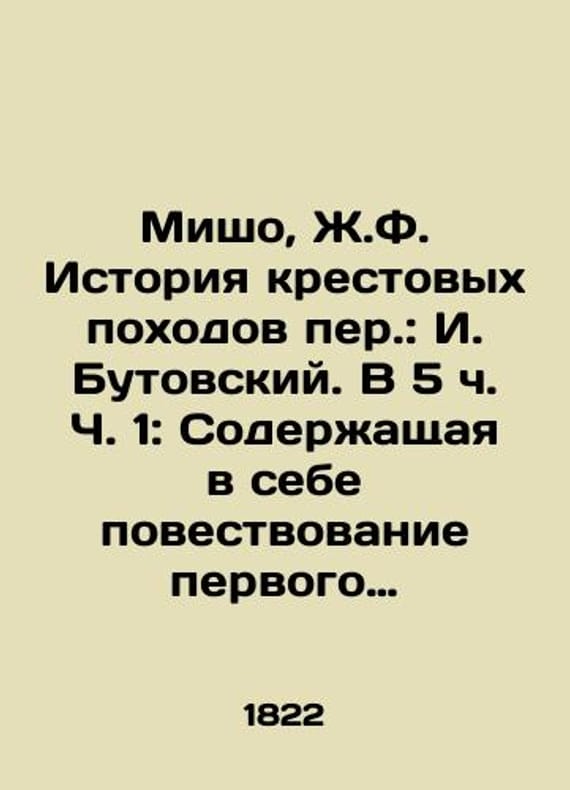 Michaud, J.F. The History of the Crusades, Translated by I. Butovsky. At 5 oclock Part 1: Containing the Story of the First Crusade./Misho, Zh.F. Istoriya krestovykh pokhodov per.: I. Butovskiy. V 5 ch. Ch. 1: Soderzhashchaya v sebe povestvovanie pervogo krestovogo pokhoda. Michaud, J.F. The History of the Crusades by I. Butovsky. At 5: Part 1: Containing the Story of the First Crusade. St. Petersburg: Printed in the Military Printing House of His Imperial Majestys Chief Staff, 1822. 10, XXXIX, 3-780 We have thousands of titles and often several copies of each title may be available. Please feel free to contact us for a detailed description of the copies available. SKUbd-cb7a3c63ccf805aa.