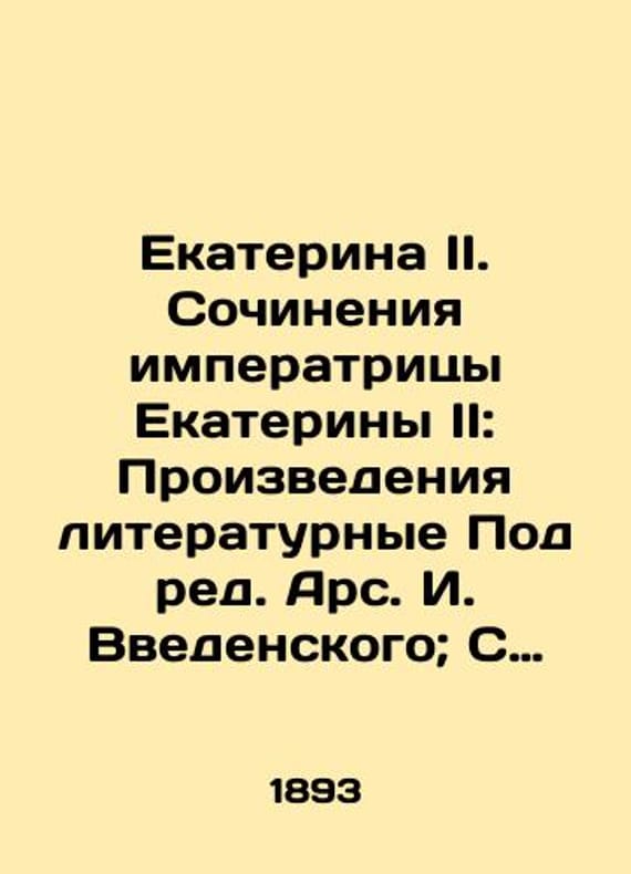 "Catherine II. Works by Empress Catherine II: Works of Literature Under the editorship of Ars. I. Vvedensky; With the portrait of the author, Graf. I. F. Deininger, and an outline of her literary activity A. Vvedensky./Ekaterina II. Sochineniya imperatritsy Ekateriny II: Proizvedeniya literaturnye Pod red. Ars. I. Vvedenskogo; S portr. avt., grav. I.F. Deyningerom, i ocherkom ee literaturnoy deyatelnosti A. Vvedenskogo. Catherine II. Works by Empress Catherine II: Works of Literature Edited by Ars. I. Vvedensky; St. Petersburg: A.F. Marx, 1893.-448We have thousands of titles and often several copies of each title may be available. Please feel free to contact us for a detailed description of the copies available. SKUbd-cf3c7dc40d09ea3c."