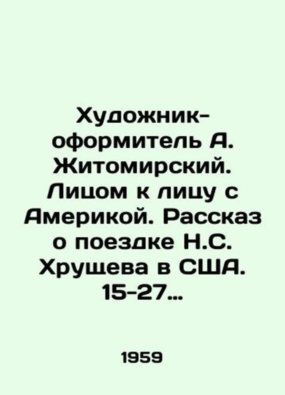 Artist-decorator A. Zhitomirsky. Face to Face with America. A Tale of Nikolai Khrushchevs Trip to the USA. September 15-27, 1959./Khudozhnik-oformitel A. Zhitomirskiy. Litsom k litsu s Amerikoy. Rasskaz o poezdke N.S. Khrushcheva v SShA. 15-27 sentyabrya 1959 goda. Artist-decorator A. Zhitomirsky. Face to Face with America. A Tale of Nikolai Khrushchevs Trip to the USA. September 15-27, 1959. We have thousands of titles and often several copies of each title may be available. Please feel free to contact us for a detailed description of the copies available. The delivery of this book might be delayed beyond the usual timeframe due to extended processing and preparation before shipment, and faster shipping options are not offered. Please inform us if you need the order by a certain date or have a deadline.SKUbd-d02be730a1481295