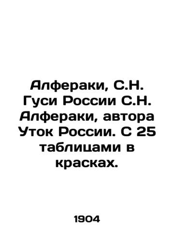 Alferaki, S.N. Geese of Russia, S.N. Alferaki, author of Ducks of Russia. With 25 tables in colors./Alferaki, S.N. Gusi Rossii S.N. Alferaki, avtora Utok Rossii. S 25 tablitsami v kraskakh. Alferaki, S.N. Geese of Russia, S.N. Alferaki, author of Ducks of Russia. With 25 tables in paint. Moscow: Tipo-lit. T-va I. N. Kushnerev and Co., 1904. We have thousands of titles and often several copies of each title may be available. Please feel free to contact us for a detailed description of the copies available. SKUbd-d1fbb840a566fe0c.