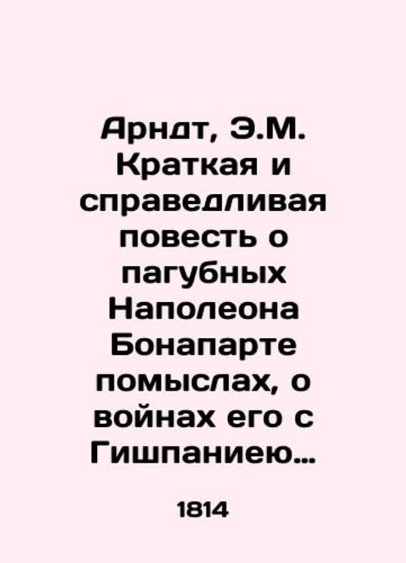 "Arndt, E.M. A Short and Fair Tale of Napoleon Bonapartes Malevolent Thoughts, His Wars with Gishpania and Russia/Arndt, E.M. Kratkaya i spravedlivaya povest o pagubnykh Napoleona Bonaparte pomyslakh, o voynakh ego s Gishpanieyu i Rossieyu Arndt, E.M. A short and just account of Napoleon Bonapartes malign thoughts, of his wars with Gishpania and Russia, of the extermination of his troops, and of the importance of the present German war: A book, written to comfort and instruct the German people, translated from German by Alexander Shishkov. - St. Petersburg: In the printing house of V. Plavilshchikov, 1814.-4, 117, 1 p.;. We have thousands of titles and often several copies of each title may be available. Please feel free to contact us for a detailed description of the copies available. SKUbd-d45e07e48cb0c810."