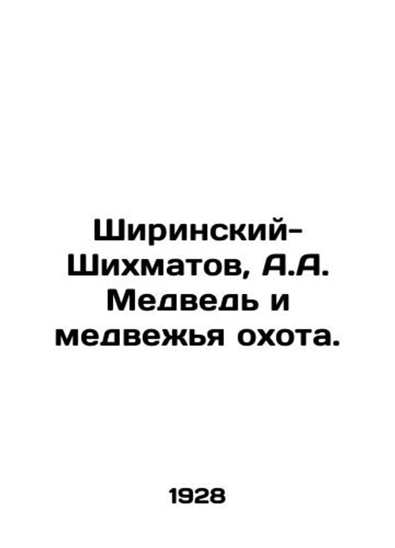 Shirinsky-Shikhmatov A.A. Bear and Bear Hunting. In Russian /Shirinskiy-Shikhmatov A.A. Medved i medvezhya okhota. With plans and drawings. Edited and introduced by S.A.Buturlin. Foreword by N.V.Krylenko. L. Edition of the journal Hunting and Nature. 1928. 78 p. We have thousands of titles and often several copies of each title may be available. Please feel free to contact us for a detailed description of the copies available. SKUalbfa732b0029e43799.